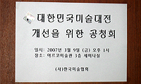 - 대한민국 미술대전 부정 시비와 관련, 3월9일 오후 동숭동 아르코미술관에서 한국미술협회 주최로 '대한민국미술대전 개선을 위한 공청회'가 열렸다. 한국미술협회 기획정책위원회 위원장인 서양화...