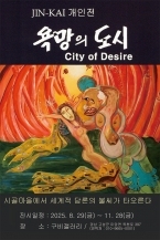 JIN KAI: 욕망의 도시 City of Desire시골마을에서 세계적 담론의 불씨가 타오른다2025.8.29 금 - 11.28 금구비갤러리 010-9665-0001경남 고성군 마암면 옥천로 397작가노트JIN KAI의 작업은 연극 무대에서 비롯된 감각을 회화의 조형 언어로 치환하는 데서 출발합니다. 무대 위의 긴장과 휘발성은 화면 속에서 새로운 형상으로 굳어지며, 이는 작가가 명명한 ‘비극...