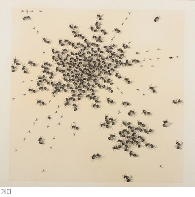 “개미”, 다리가 뜯겨지고 몸통이 부서진 개미들로 이루어진 군상은 전후의 상처와 혼란스러운 시대상을 적나라하게 표현한 작품이다.