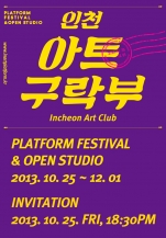 인천아트플랫폼은 2013년 10월 25일(금)부터 12월 1일(일)까지 2013 플랫폼 페스티벌 & 오픈스튜디오 <인천 아트 구락부>를 개최한다. 10월 25일(금) 오후 6시 30분 “플랫폼 별이 빛나는 밤에” 오프닝으로 시작되는  행사는 중․동․남구의 문화예술공간들의 네트워크 오픈스튜디오, 인천아트플랫폼 레지던시 오픈스튜디오, 플랫폼 입주예술가들의 전시, 기타 다양한 프로젝트들로 구성되어 있다. 10월 25일(금) 오프닝은 지금까지 아트플랫폼에 입주했던 작가들의 작품과 공연 그리고 영화를 함께 만나볼 수 있으며 참여 예술가들과 함께하는 네트워크 파티가 진행된다. 인천아트플랫폼은 이번행사를 통해 레지던시 입주예술가들과 인천시민, 예술인들이 함께 모여 편안히 인천의 문화예술에 대한 이야기를 나눌 수 있기를 기대한다.