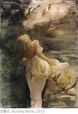 천홍즈는 대학 졸업 후, 줄곧 투명한 아크릴판에 아크릴염료로 그리는 작업을 이어오고 있으며, 처음에는 평면으로 시작한 아크릴판 작품은 최근 입체적인 설치미술로 발전하였다. “요양원” 시리즈에서 그는 심리적 치유나 도덕적 개선이 필요한 인물들을 표현하였다. 아크릴판 너머에 이미지와 평행을 이루며 드리워진 이미지의 그림자는 평행우주론을 연상시키며, 화면 속 인물의 위태로운 모습은 관객의 심리를 부추겨 이런 저런 결론을 추측해보게끔 한다.