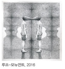 <가장 욕망하는 드로잉>의 이미지는 ‘반복’형식이 가장 큰 특징이다. 반복되면서 뒤집히고, 복제되고, 중첩되고, 쌍을 이루고, 반사된다. 반복이 거듭될수록 동일한 나를 목격하는 듯한 정체 모를 섬뜩한 감정이 지글지글 끓어오르는 연필 자국에 기입되고배경은 홀로그램처럼 교란된다. 이미지들은 하나가 둘이 되고 둘이 넷이 되고 넷이 여섯이 되는 반복만을되풀이하는 것이 아니다. 이미지가 중첩되는 경계에서 다른 이미지를 생산한다. 원본 이미지는 동어반복을 통해 차이를 낳는다. 전혀 새롭지 않지만, 전혀 새로운 것! 반복은 자기 자신을 재생산한다. 자신의 동일성을 변화시키는 것이다. 반복함으로써 미세한 차이가 바늘처럼드러나고 뒤의 의미를 완전히 바꾸며 선형적 시간을 정지시키고 얼어붙게 하여 새로운 공간을 만들어낸다. 눈앞에놓인 어떤 것을 보는 것이 아니라 그 이미지 너머를 보고야 마는 우리의 욕망은 인간의 조건이지만 이 저주받을 조건이 다른 공간을 창조할 틈을 준다는것은 기적과도 같은 반전이다.