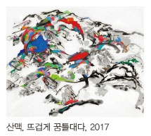 <산맥, 힘을 품다>, <산맥, 연결됨>, <산맥, 뜨겁게 꿈틀대다>에서는 양구의 산맥을 표현하기 위해 먹선이 강조되었다. 색은 먹색과 어우러지게 되면서 점차 원색으로 바뀌었다. <산맥, 힘을 품다>를 자세히 살펴보면 나중에 칠한 색을 구별해 낼 수 있을 정도로 처음 색감과 차이가 난다. 불과 몇 개월 사이에 일어난 변화다. <산맥, 연결됨>을 <산맥, 힘을 품다>와 <산맥, 뜨겁게 꿈틀대다>와 비교해보면 더 분명한 색감의 차이를 알 수 있다. 검은 먹이 색과 색을 중재해 줌으로써 원색을 사용할 수 있게 된 것이다. 또한, 강한 먹색의 힘과 균형을 맞추기 위해서도 원색은 필요했다.