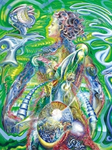 최근 작업 가운데는 명상 또는 가부좌 자세로 앉아 있는 인물이 자주 등장한다. 천부경에 근거하는 이와 같은 자세의 인물상은 자기수행의 한 방편이라고 할 수 있다. 완전한 자아의 실현을 통해 이상적인 참된 인간상을 지향하는 것이다. 정좌한 상태에서 신체는 비활성화 되는 듯싶지만 다만 온유한 상태로 바뀔 뿐이다. 신체활동이 억제되는 가운데서 정신은 오히려 활성화된다. 이러한 상태의 심신에서 발생하는 에너지의 파장이 다르게 나타나리란 것은 자명하다. 아우라처럼 신체의 외연을 감싸고 있는 유기적이고 활동적인 의식 활동의 파장이 신체리듬에 어떻게 영향하는가를 시각적인 이미지로 보여주려는 것이다. 여기에다 빛이 가세함으로써 신체 및 정신의 에너지는 더욱 활성화된다. 그의 작품에서 정좌한 상태의 인물들은 이렇듯이 완전무결한 자아를 실현하는 과정을 상정한다.