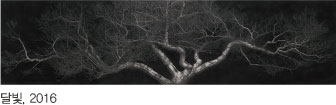 숲과 나무는 깊은 어둠의 공간 속에서 기지개를 펴는 표정인데 달빛에 비친 음혈의 신령한 존재로서 드러나며 달빛소리, 달빛기운, 달빛냄새가 목탄으로 채색되고자 하는 의지이다.
