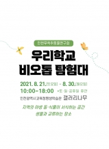 전시소개: 우리 학교 비오톱 탐험대는 지역 사회의 전문가와 학교 그리고 아이들이 함께 만들어 가는 교육 프로그램이면서 지역민이 관심을 가져야 하는 과제이다. 비오톱은 야생생물이 서식하고 이동하는 데 도움이 되는 숲, 가로수, 습지, 하천, 화단 등 도심에 존재하는 인공·자연물로 지역 생태계 향상에 기여하는 작은 생물 서식 공간을 말한다. 이번 전시회는 작은 학교 공간을 활용하여 자연의 소중함을 알면서 자연의 소리를 듣고 변화를 확인하는 과정의 결과물을 알리는 전시회이다. 책에서 볼 수 있는 다양한 생물의 관찰이 가능하며 이러한 호기심을 통해 환경의 소중함을 알아가는 결과물 약 50여 점 전시할 예정이다.