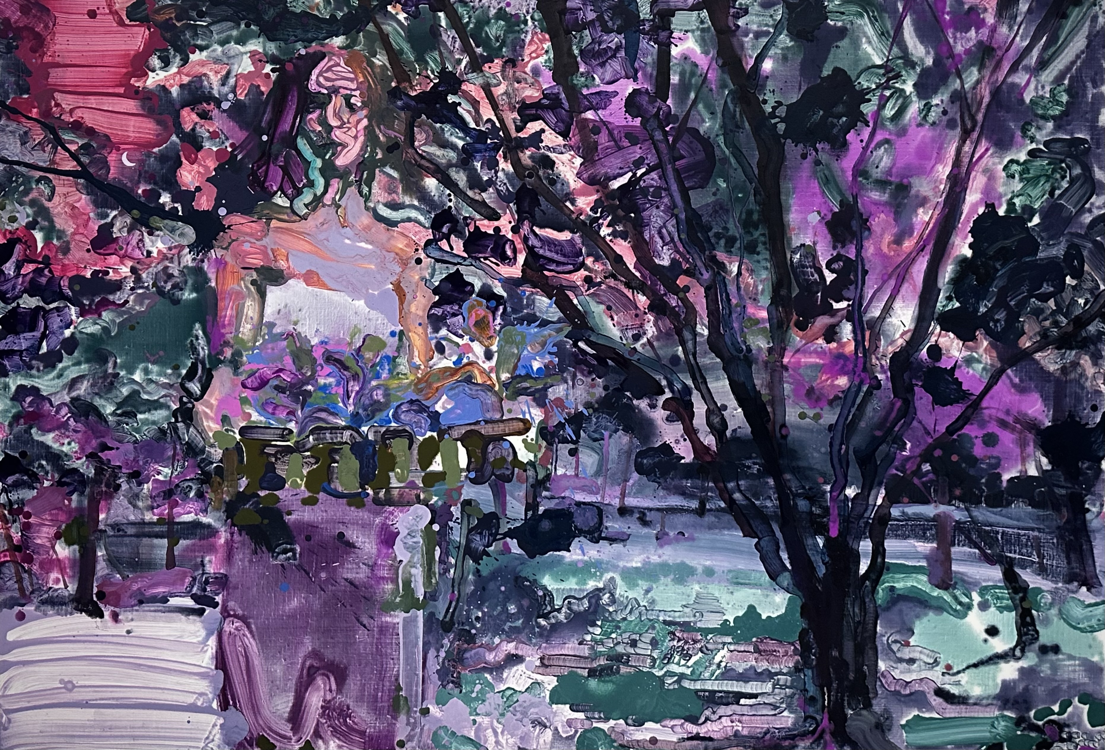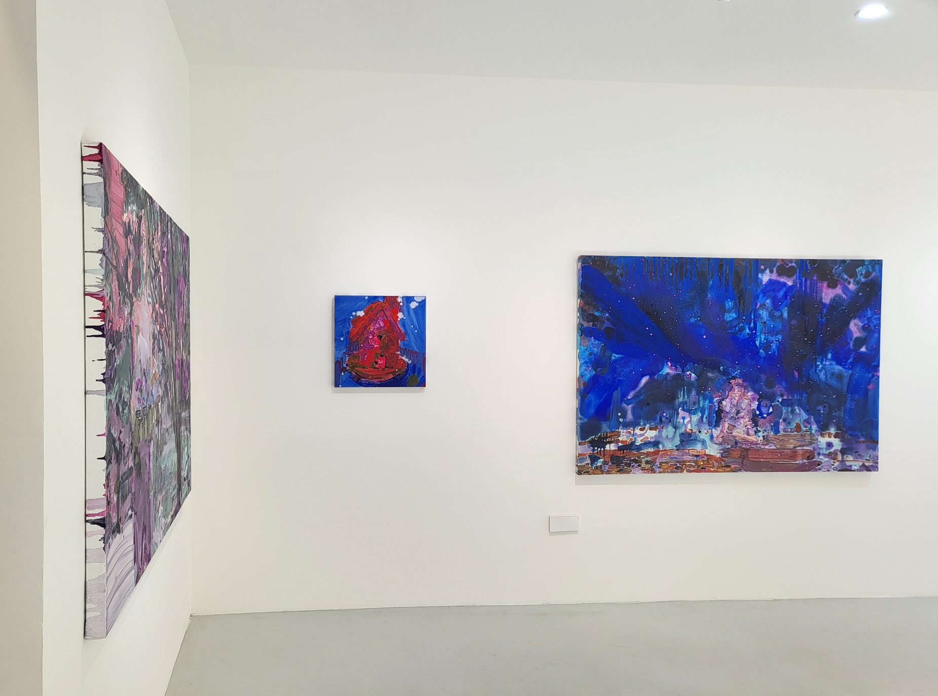 작가노트 ㅣ 본인은 색 대비와 자유롭고 대담한 붓질, 추상과 구상의 경계를 흐리는 방식을 통해 섬세한 환상과 불안을 시각화한다. 작업의 모티브는 개인적인 요가 수행을 통해 체화된 감각을 기록한 일기에서 출발하며, 특히 수행의 마지막 단계인 사바아사나에서 경험되는 짙은 어둠은 작품 속에서 ‘밤’이라는 메타포로 전이되어 반복적으로 호출된다.