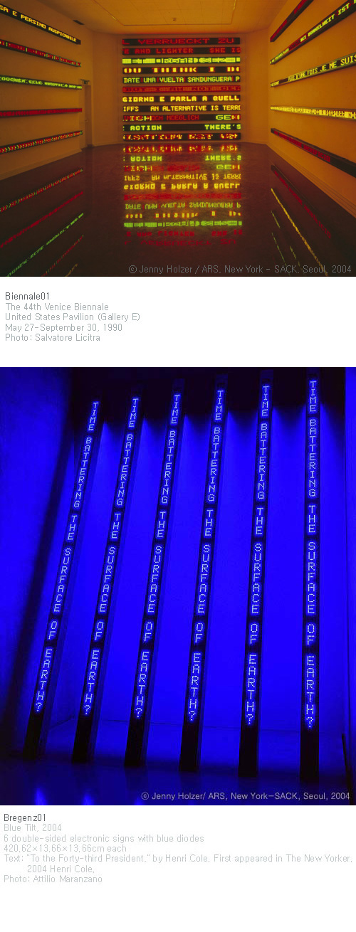 제니 홀처는 지난 25년 동안 베를린의 뉴 내셔날 갤러리, 레치타그 등의 건물, 그리고 뉴욕과 빌바오의 구겐하임 뮤지엄을 포함한 무수한 공공장소 및 국제 전시에서 신랄한 아이디어, 논쟁, 슬픔 등에 대해 보여주고 있다. 티셔츠, 명판, LED사인 등의 형태로 제작되어 보여주는 그녀의 작품의 매체는 글이며 필수적으로 공공의 차원에서 읽혀진다. 홀처는 뉴욕 시내 곳곳에 포스터를 부착하기 시작한 1970년대 후반부터 최근의 자연풍경 및 건물에 영사하는 제논(xenon) 프로젝션 작업까지 그녀는 무지와 폭력과 맞서는 유머, 친절함, 도덕적 용기 등에 대한 작업을 하고 있는 것이다.