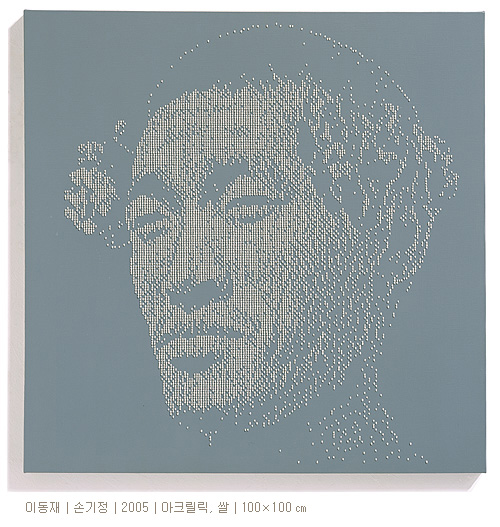 이동재는 손기정, 황영조, 마이클조던과 같은 스포츠 스타의 초상을 쌀을 이용한 작업으로 그려내고 있다.