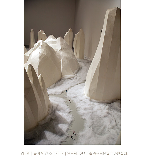 임 택의 작품은 새하얗고 거대한 설산과 그 산을 오르거나 바라보는 알록달록 조그만 사람들의 대비가 흥미를 불러일으킨다.