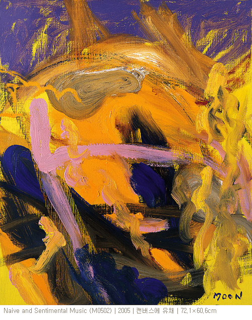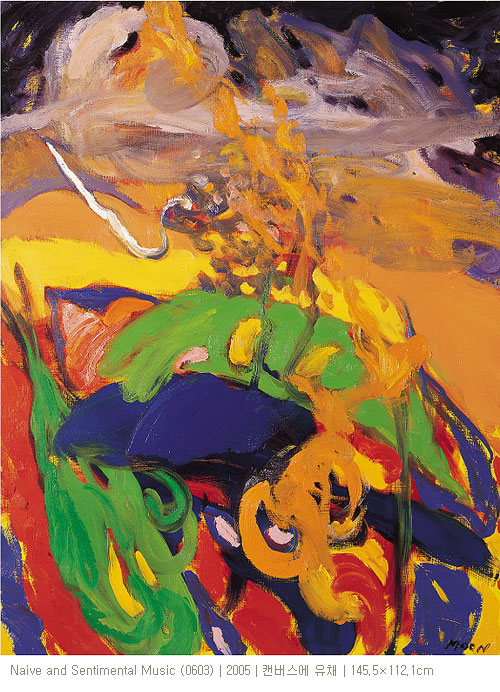반대로 기이한 형태들이 아르누보식으로 표현된 또 다른 유화인 <재즈의 환상(트럼펫)>은 듀크 엘링턴의 주요 작품 중 하나에 나타나는 대조적인 도시적 세련미를 암시한다고 볼 수 있다. 이 그림과 앞의 그림에서 문혜자는 시골의 여인숙에서 수수하게 시작하여 결국 재즈가 유럽의 고전음악과 동등하게 대접받는, 커다란 연주회장에 당당하게 이르는 음악적 진화과정을 우리에게 안내하는 투어를 하고 있는 셈이다. 그러나 비록 작품 속에 그러한 상상의 내용이 담겨있긴해도 문혜자의 그림들은 독특한 회화적 감수성을 독자적인 추상으로 표현한, 순수하게 형식적인 언어에 대한 관심도 유지하고 있다.