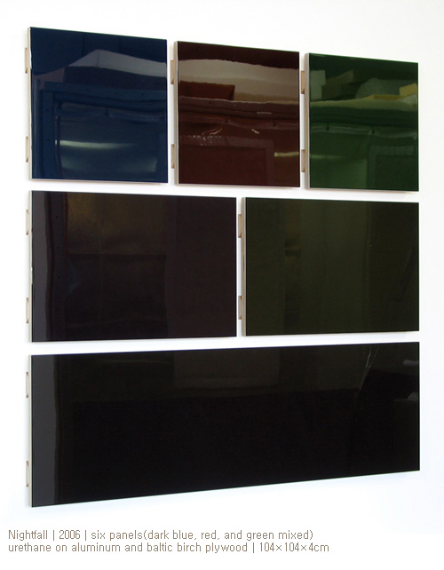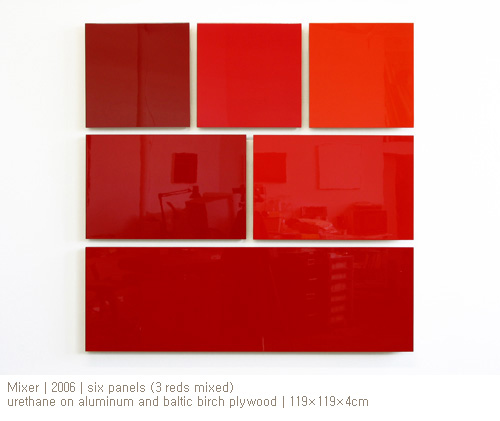 지난 12월, 나는 다가올 더 컬럼스 아트센터 전시회를 위해 패널들을 구성하기 시작했고 3월에 첫 “혼합”을 완성했다. 결과는 놀라웠다. 우선, 나는 위에 올라가는 처음 세가지 색을 선정하는 일에 많은 어려움을 겪었는데 그 과정 속에서 어느 색을 조합해도 늘 흥미로운 결과를 얻어낼 수 있다는 확신을 얻게 되었다. 하지만 곧 나는 본질적으로 많은 차이를 안고 있는 색을 조합하게 되면 전체적으로 패치워크 같은 느낌을 주게 되고 이는 하나의 통일된 작품으로 감상되지 못한다는 사실을 알게 되었다. 또 나는 혼합 과정에서 요구되었던 정교함과 치밀함에 놀라지 않을 수 없었다. 개별적 패널 하나 하나의 색채에는 상당한 집중력이 요구되었지만 완성된 여섯 개의 패널들은 특별한 배치 방법 없이도 서로 너무 쉽게 잘 어우러졌기 때문이다. 하지만 이보다 더욱 놀라웠던 것은 어느새 “내가 페인팅을 하고 있었다!”라는 사실이었다. 페인팅에 조각 같은 입체감을 시도하기 시작하면서 내가 페인팅의 영역에서 느낄 수 있는 개념이고 미적인 가능성들을 상실했었다는 사실을 깨닫게 되었다. “혼합”을 통해서 나는 회화가 지니는 시적이라고 할까, 잔잔한 이야기 같은 느낌을 새로이 발견하게 되었고 그것은 너무나도 자연스러웠다. 다음의 세 페인팅들은 하늘에서 떨어져 나온듯하다. 하나 하나 모두 지금 막 나의 옛 친구를 다시 만났다는 것을 알려주기라도 하듯이……