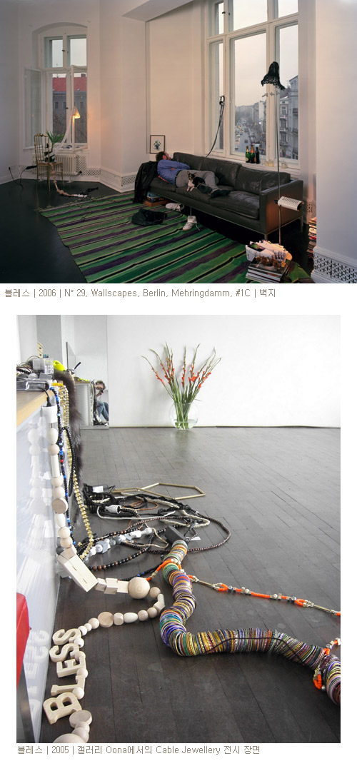 Bless우리 일상생활에서 컴퓨터, 핸드폰 충전기, 전화기, 프린터, 텔레비전, 스테레오 등의 전자제품들은 하루라도 없어서는 안 되는 필수품이다. 그리고 이러한 것들을 사용하기 위해서는 전기를 공급해 줄 플러그와 전선이 필요하다. 보통 전자제품과 전기를 연결하는 멀티 탭, 어댑터, 플러그, 커넥션 그리고 핸드폰 충전기 등의 케이블들은 대부분 공간의 아름다움을 방해하는 요소로 여겨져 왔기에 항상 보이지 않는 곳에 숨겨야 할 것으로 취급되는 천덕꾸러기이다. 이번 전시에서는 이 천덕꾸러기들의 새로운 변신이 시작된다. 우리 일상에서 자