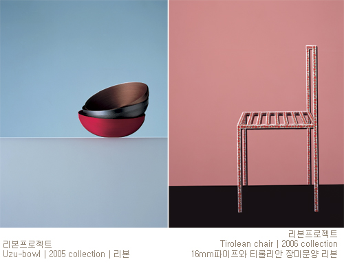 Ribbon Project리본프로젝트는 테이프와도 같은 리본의 특성에 주목하여 리본을 묶거나 감아서 리본으로 구성된 고체형의 물건을 제작하고 제품의 표면을 리본으로 구성한다. 리본은 기본적으로 선물을 포장하고 장식하는데 쓰이기 때문에 우아하고 고상한 느낌을 표현하기에 알맞은 매력적인 재료이며 편안함과 아름다움을 느낄 수 있게 한다. 또한 리본은 하나의 직물로서, 매우 심플하면서도 감각적이다. 리본프로젝트는 이러한 특성을 일상생활에서 쓰이고 있는 평범한 물건들에 접목시켰고, 인테리어 소품의 표면을 리본으로 감싸거나 리본과 함께 재봉하는 간단한 과정을 거쳐 새로운 감각의 제품으로 탄생시켰다. 리본프로젝트의 모든 제품들은 이노우에(Inoue) 리본산업에서 제조된 리본으로 제작된다. 이노우에 리본 산업 주식회사는 1948년 창립되었으며 일본에서 가장 영향력 있는 리본 및 직물 생산회사이다.