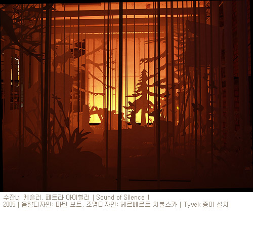 Sound of Silence 어둠속에서 눈을 조정하고 예상치 못한 미묘한 분위기를 감지하게 되면 우리의 귀는 침묵 속에 내재된 소리의 우주에 노출되게 된다. 사운드 오브 사이런스(Sound of Silence)는 침묵의 다양한 특성들을 드러내고, 오디오-비주얼적인 설치를 통해 침묵의 경험을 가능하게 만드는 환경을 제공한다. 건축가 페트라 아이힐러(Petra Eichler)와 예술가이며 연출가인 수잔네 케슬러(Susanne Kessler)는 침묵 그 자체로서 경험될 수 있는 공간을 만들어냈다. 이 공간에 들어서면 정신적이며 신체적으로 고요함을 느낄 수 있다. 관람객은 도심 속에서 경험하는 온갖 소음에서 벗어나 낭만이 넘쳐흐르는 특별한 상황으로 이끌리게 된다. 작업의 컨셉은 섬세한 것의 조용한 힘을 나타낸다. 전시장에는 각각의 개별적인 패널들은 숲의 장면들을 정교하게 묘사하여 전체적으로 패널들은 하나의 숲을 만들어낸다. 작품 뒤쪽에 실제적인 벽이 위치하여 간접적인 조명이 작품을 비추며, 점차적으로 색상이 변화하는 형광 조명은 일출에서 일몰까지의 다양한 시간의 분위기를 연출한다.