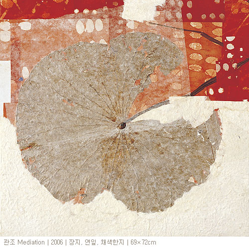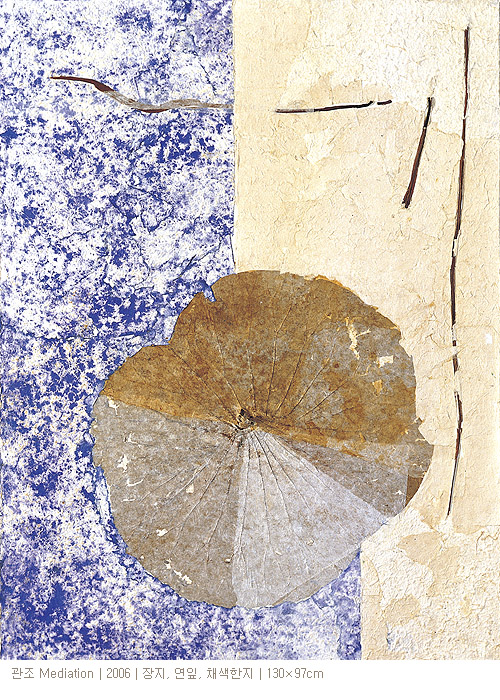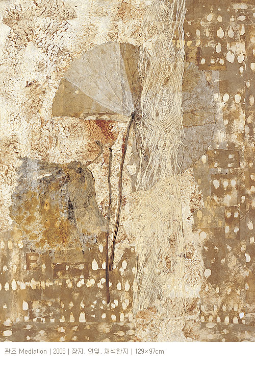송수련은 이러한 한국인 특유의 정신을 바탕으로 하고 있으며, 작품에서 보이는 절제된 형식 역시 그러한 격을 드러내려는 고차원적 의도에서 비롯된 것이라고 해석된다. 그렇다면 그 절제된 형식 이면에 들어있는 풍요로움은 무엇일까? 이번 전시회에서 그녀는 작품에 연잎을 등장시켰다. 커다란 연잎을 잘 말려 화면에 접착하고, 그 위에 한지를 붙여 고정시켰다. ‘붙여 고정시켰다’는 표현보다는 ‘붙여졌다’라는 표현이 더 적합할지도 모를 정도로 그 밀착이 자연스럽다. 마치 오랜 시간의 풍화를 거친 화강암처럼 마른 연잎의 섬유질과 한지의 섬유질이 자연스럽게 얽혀져 있다. 사실 종이도 그 고향이 나무인지라 이들의 만남은 명절날 시골의 고향을 찾는 사람처럼 반가운 만남이다. 오랜만에 고향의 산천을 보게 되면 각박한 현실로 상처 난 마음이 위로되고 동심으로 돌아가듯이, 종이와 연잎의 만남은 어떤 목적으로 일시적으로 헤어져 서로 다른 것처럼 인식되어 왔던 것이 본래는 하나였다는 새삼스러운 사실을 환기시킨다.