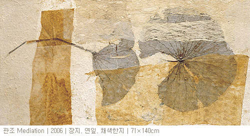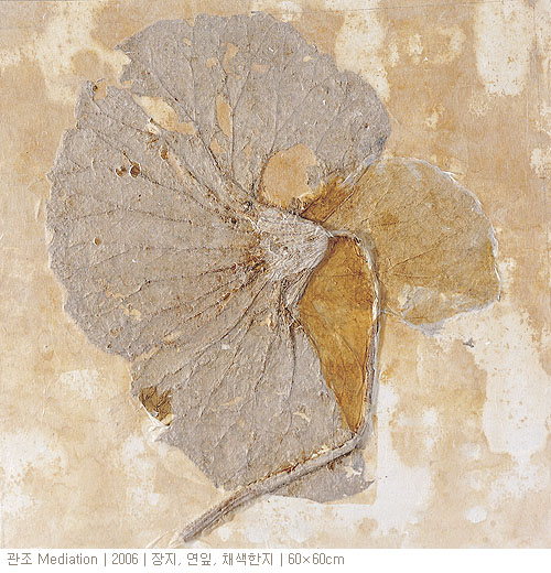 ‘관조’라는 타이틀은 본질을 응시하려는 영혼의 시선과 사물의 추상적 본질에 닿으려는 작가의 소망을 표현한 것, 사람들의 관심에서 멀어진 곳에 더 오래 머물기에 표현 사용한 연잎. 꽃을 떨구어낸 연잎에서 쇠락한 자연이 아니라 시간의 궤적을 보여주는 전시
