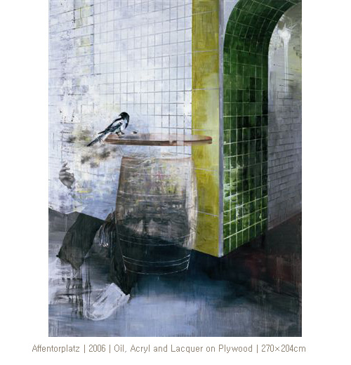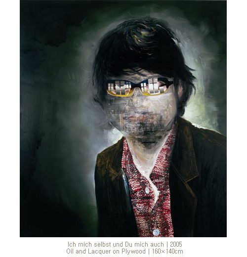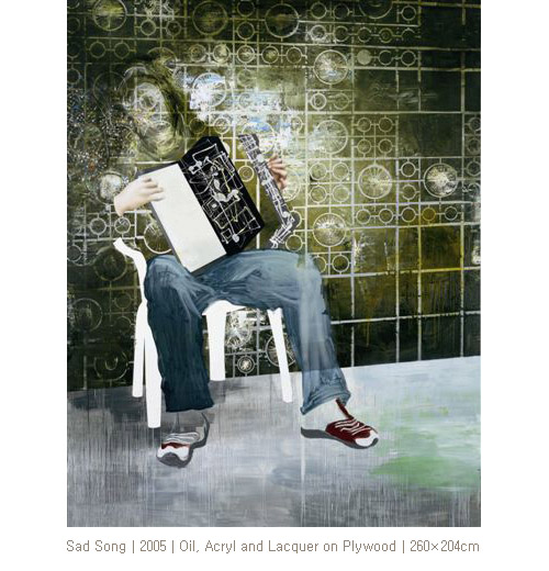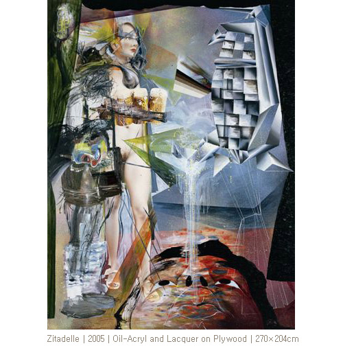 에서 폭발음이 들리는 듯 조각난 공간들과 거친 표면들, 에서 에어브러쉬로 표현된 마네킨과 같은 나체의 여인과 회화적인 배경은 서로 대비되며 추상과 구상 사이의 혼란스런 간격을 회화의 물리적인 요소들로 결합하고 있다.