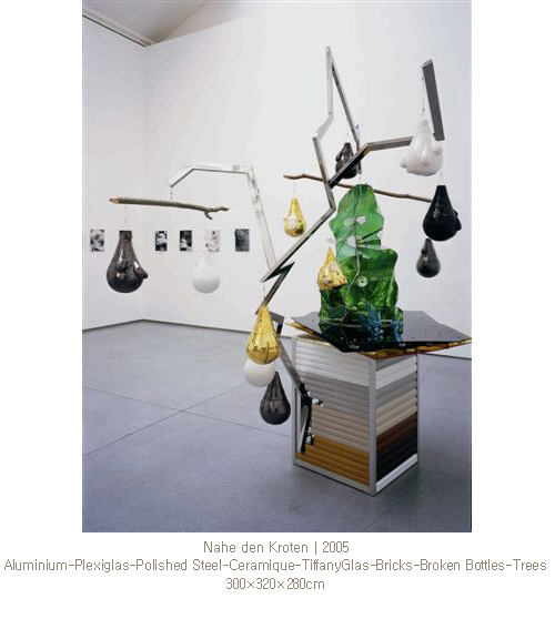 특히 시각적 이미지들의 총집합이었던 그 복잡한 회화 구조는- 브리콜라쥬 (Bricolage; 다양한 도구를 닥치는 대로 써서 만든 것) 형식을 이용한 3차원적 공간감을 더한 거대한 입체작업으로 완성하였다. 지난 17세기 카메라의 원형인 카메라 옵스큐라 (camera obscura; ‘어두운 방’이라는 의미)가 그 당시 사물을 바라보는 시각을 바꾸고, 원근법을 표현하는 새로운 장치가 된 것처럼 번하드의 설치 작품 <어두운 방(Dark Room)>은 2차원적인 시각적 요소들을 유리, 브론즈, 크리스탈, 메탈 등의 다양한 오브제들을 사용하여 21세기의 새로운 시각적 표현법 탐구를 통해 양산된 3차원적 결과물이다.