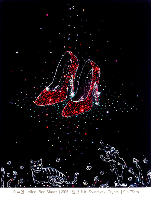 이수연 작품 속의 앨리스는 더 이상의 귀엽고 천진난만한 아이가 아니며, 지극히 현실적인 화려함의 꿈을 쫓는 현대여성이 되어버렸다. 오늘날 고가의 다이아몬드 대신 화려함으로 치장하고 싶어 하는 모든 여성들이 백화점의 매장 앞을 그냥 지나치지 못하게 하며, 기웃거리게 만드는 ‘크리스탈 구두’는 현대를 살아가는 여성들의 욕망이자 가질 수 없는 매력적인 기호이다.