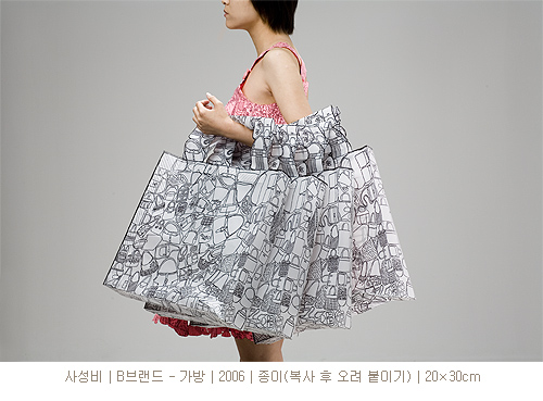 사성비나의 작업은 어린시절 인형놀이의 판타지에 시대적 사회현상을 오버랩 시킨다. 종이인형의 이미지는 마치 씨실과 날실처럼 직조된 표면을 구성하게 되는데, 옷의 이미지가 옷을, 가방의 이미지가 가방을 만들어낸다. 이러한 이미지로 만들어진 옷과 가방은 “B브랜드”라는 로고를 부여하여 브랜드와 개인의 정체성을 동일시하며 자본주의 사회학적 메커니즘 속 욕망의 미학을 즐거운 놀이로서 해체시킨다.
