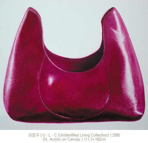이준구 명품가방이라는 살아있지 않은 존재, 단지 무생물인 존재. 하지만 현대인들 모두가 탐을 내며, 소유하고 싶은 대상임은 틀림없다. 그런 소재를 선택하여 멀리서 보면 예쁘고 화려한 가방의 이미지지만 다가서면 알 수 없는 생명체들이 가방 표면에서 꿈틀거리거나 가방 안에서 밖으로 나오려고 하고, 손잡이나 가방의 일부로 변해가는 기묘한 명품가방 이미지를 그려내고 있다. 이처럼 가방에 새로운 이미지를 부여한 것은 작가가 물질만능주의를 비판 또는 조롱하기 위해서라기보다는, 명품가방이 가지고 있는 살아있는 자체가 더 소중하고 값진 것이며, 생명을 불어 넣을 때 더 큰 가치가 있다는 것을 보여주고 싶기 때문이라고 이야기하고 있다.