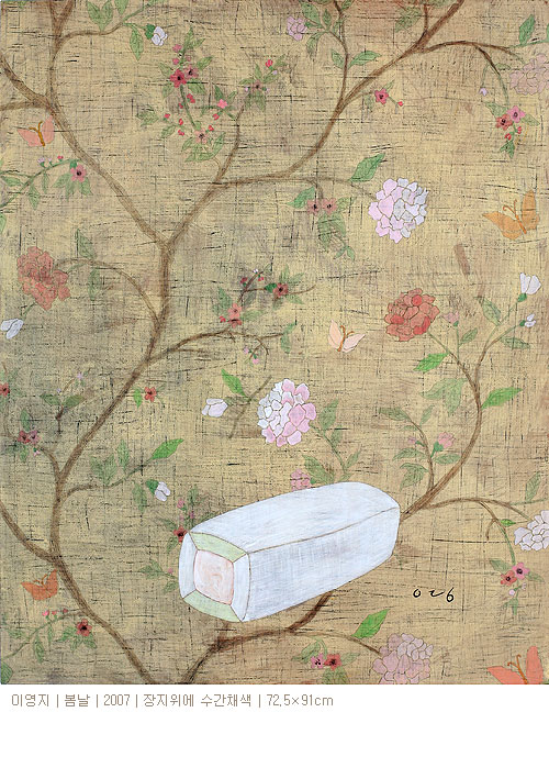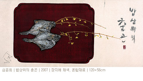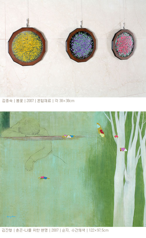 그리고 형상적 측면에서 보면 한층 깊이 있는 사유의 흔적이 느껴진다. 개나리를 물고 있는 밥상위의 생선을 통해 꿈과 현실, 생성과 소멸, 고단함과 나른함의 양가감정을 표출하기도 하고, 호접몽을 대입해 봄날의 나른한 꿈과 현실사이에서의 상호 소통과 단절을 드러내기도 한다. 때로는 녹색의 배경위에 졸고 있는 인물을 그려 넣음으로서 싱그러움과 노곤함을 직접적으로 중첩시키기도 하고 거울이라는 오브제 위에 채색을 가함으로서 화면위에 올려진 물감의 흔적과 화면 너머의 거울에 비친 영상의 대비를 통해 춘곤이라는 주제가 던져주는 아이러니를 다른 방식으로 보여주기도 한다.