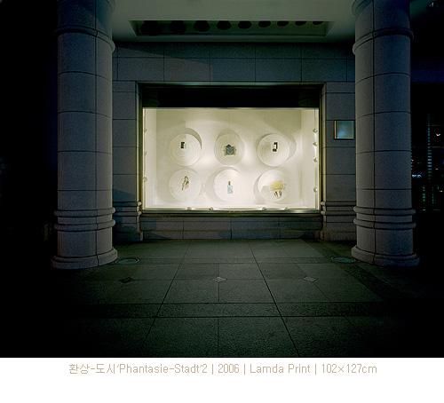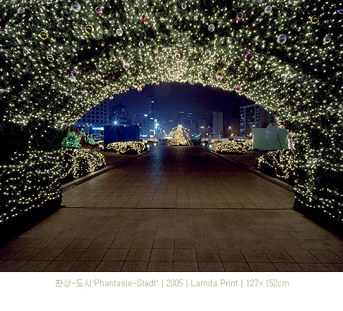 이익재의 야경 사진들도 다르지 않다. 그곳이 이벤트를 위해서 지어진 조형물이든 영화를 보거나 쇼핑을 위해 우리가 찾아가는 메가 복스의 실내 풍경과 루비똥 백화점의 외부 풍경이든 이익재의 사진 프레임 안에 들어 있는 공간들은 모두가 시장 공간들이다. 그 공간들의 주인은 상품들이며 우리는 그 공간 안에서 다만 소비 주체로서의 역할만을 지닐 수 있을 뿐이다. 하지만 보다 중요한 건 이 공간들이 상품들과 우리들 사이의 도치된 주인-하인의 관계를 미처 깨닫지 못하도록 장치화 된 공간, 즉 판타스마고리의 공간이라는 사실이다. 다시 말해서 이 공간들은 모두가 밤이라는 자연의 몸 안에 인공광과 인공색을 수혈하여 만들어진 일종의 사이비 자연 공간이며 기술적으로 재창조된 그러한 사이비 자연성 때문에 우리는 그 안에서 일어나는 모든 일들을 마치 자연 현상인 것처럼 받아들이는 현혹상태에 빠져드는 것이다. 그러한 현혹관계를 깨닫는 일은 쉽지 않다. 실제 공간을 본래의 콘텍스트로부터 분절한 다음 빛과 색의 디지털 리터칭을 통해 개개의 공간들을 보다 환상적으로 재구성하는 이익재의 야경 사진들은 대도시 공간의 판타스마고라적 성격을 역설적으로 드러내기 위한 사진적 전략일 것이다.