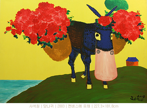 이번에 전시 될 사석원씨의 작품은 150호 크기의“쿠바 하바나”, “꽃과 당나귀”와 “석불과 새”, “소녀와 강아지”, “꽃”등으로 다양한 작품을 감상 할 수 있다. 사석원은 각 작품에서 동화적인 소박함과 즐거움을 안겨 주기도 하고 때로는 환상적인 분위기를 보여 주면서 작가 특유의 경쾌한 느낌을 전달하고 있다.