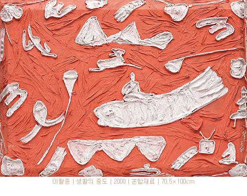 김병종씨의 작품 “생명의 노래”는 그동안 작가가 꾸준히 작업해 온 생명을 화두로 지극히 한국적인 것을 추구하는 작가로 스미고 번지는 한지의 먹과 미를 살려냈다. 중간 중간에 극도로 생략 된 선으로 만든 여러 형체의 앙증맞은 모습이 더 정겹고 따뜻하게 느껴진다.