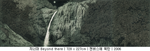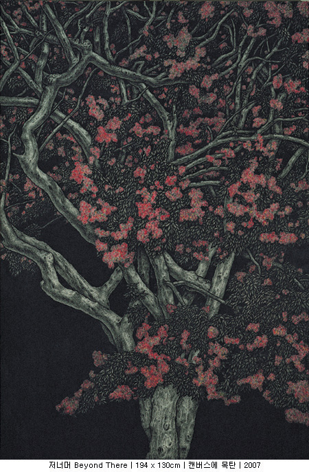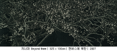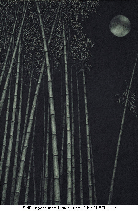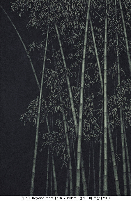 간혹 그를 대나무를 그리는 작가로 오인하는 사람들이 있다. 하지만 그는 말한다. 이번 전시가 대나무를 보여주는 마지막 전시가 될 것이라고. 실제로 그는 이번 전시를 통해서 처음으로 매화를 선을 보였다. 그리고 앞으로는 소나무도 보여줄 생각이라고 한다. 소나무, 대나무, 매화(松竹梅). 한겨울 세찬 바람과 혹독한 추위 속에서도 본연의 색을 잃지 않는다는 세 친구가 아니던가. 비록 그가 세한삼우(歲寒三友)라는 동양화 소재를 빌어 왔지만 곧바로 ‘선비정신’을 연상한다면 조금은 성급한 감이 있다. 그보다 먼저, 작품의 제목을 살펴보자. 저 너머(beyond there). 모든 작품의 제목이 똑같다. 사실 그의 작업을 이해하기 위해서 빼놓을 수 없는 것이 바로 이 제목이다. 십여 년이 넘도록 모든 작품의 제목을 하나같이 ‘저 너머’라고 붙이는 작가의 의도가 궁금하지 않을 수 없다. 그러자 그는 말한다. 자신이 주목하는 것은 사물 그 자체가 아니라 사물과 사물 사이, 그 경계가 만들어내는 빈 공간이라고.