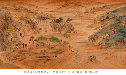 박영길의 ‘춘풍행락도’는 사생에 의한 진경산수와 관념산수를 혼용하고 부감법 등을 사용한 구도로 광활하고 드라마틱한 풍경을 연출한다. 배경은 조선시대 후기 작품에서나 봄직한 청록산수의 필법을 차용하였고, 여기에 미니어처 같은 작은 인물을 화면 곳곳에 병치시킴으로써 마치 현대인들이 타임머신을 타고 약 200년쯤 과거로 거슬러 올라가 도심으로부터의 일탈로 여유롭게 사색하는 모습을 담아내고 있다. 이 작품은 길이 10미터가 넘는 대형 작품으로 시작과 끝을 알 수 없는 작품이다. 그러나 그것은 중요하지가 않다. 또 어디서부터 감상하든 무방하다. 스토리가 있는 것이 아니고 볼거리가 있으며 고정된 시선이 아닌 시선의 이동이 자유로운 작품이다. 목장, 공동묘지, 수목원, 공원, 산책로, 계곡 등에서 흔히 볼 수 있는 이웃 같은 인물들이 익숙하고 친숙한 모습으로 다가와 오히려 새롭게 느껴지기도 한다. 또한 자칫 배경과 인물이 다소 이질적인 느낌을 줄 수도 있으나 이 두 요소를 조화롭게 연결시킴으로서 동화된다. 이처럼 박영길의 풍속화 작업은 형식적으로는 전통을 수용하면서도 내용적으로는 현대적 관점으로 재해석되어 이해됨으로써 지극히 현대적이다.