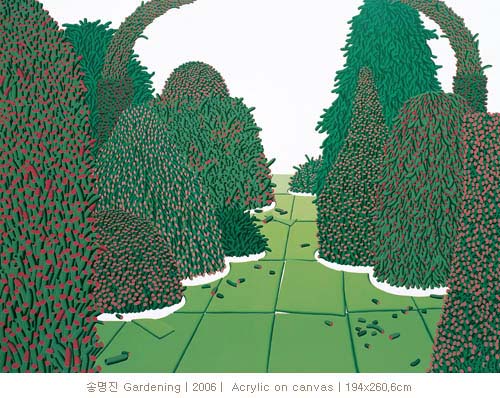 그러나 송명진의 녹색 파라다이스는 생명과 창조보다는, 누더기처럼 기워진 인공적 장소임이 드러난다. 여기에서 자연은 이상적 세계에 대한 상상이며 동시에 문명의 가공물이다. 어디선가 이식해 온 잔디와 나무들이 심어진 [Gardening](2006)은 마치 몸의 일부가 잘린 동물들처럼 가지치기 된 단면이 붉다. 송명진의 작품에서 정원은 순수한 자연보다는 인공낙원의 양상을 띄고 있다. 파라다이스는 독한 양념 냄새를 풍기는 파밭으로 나타나기도 하는데, 그것은 안식처라기 보다는 탈출해야만 하는 곳이 된다. 파 밑둥은 붕대로 감겨있으며, 식물을 이루는 몸통도 실로 얽어져 있는 모습이다. 대지에 뿌리를 내렸다기 보다는 구멍에 꽂혀있다. 여기에서 자연은 19세기의 보들레르가 노래했듯이 거대한 신전과 비슷하다. 그러나 21세기의 자연은 만물과의 교감이 이루어지는 풍요로운 상징의 숲이 되지 못한다.