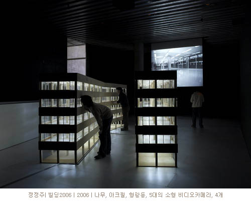 실물의 수십분의 1의 크기로 만들어진, 유리와 화강암의 벽을 뒤집어 쓴 듯한 빌딩과 환하게 조명이 밝혀진 실내. 누군가 이 곳에 와서 눈길을 준다면, 그는 이미 이 작품이 발휘하는 마법의 그물에 걸려든 셈이다. 이 건물은 하나의 ‘모형‘이 아니라, 리얼한 가상임을 전제로 만들어졌다. 그리고 이 가상세계의 입구에서 관객을 가로 막고 있는 것은, 프레임이나 경계가 아니라, 관객 자신의 ’상대적으로 거대한’ 신체이다. 관객이 진입하지 못하는 그 내부는 하나의 ‘미지의 영역’으로 현실의 저편에 남을 수밖에 없다.
