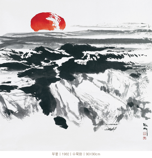일출광경을 간략한 필치에 의해 표현한 그림이다. 해가 떠오르는 장면에 대한 인상은 누구에게나 대동소이하기 마련이다. 그러기에 그림으로 표현되는 일출장면도 대체적으로 유사하다. 하지만 이 작품은 그와 같은 일반성에 일치하지 않는다. 무엇보다도 검은색과 붉은 색을 강렬하게 대비시킴으로써 시각적인 인상이 명쾌하다. 거기에다가 일체의 묘사적인 이미지를 배제한 채 농묵으로 사선으로 교차시키면서 어두운 세상을 표현한 대범한 필치는 상징성이 강하다. 부활이라는 명제가 시사하듯이 고난의 순간을 딛고 부활한 그리스도의 이미지와 일치시키려는 작가의 의지를 반영하고 있는 것이다. 추상적인 이미지를 구체적이면서도 상징적인 현상으로 w전이시키는 표현수법이 특이하다.