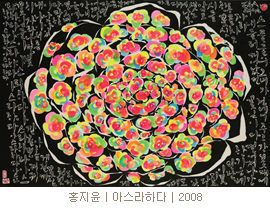 꽃도, 새도, 시도, 물방울도, 이름모를 점들도 홍지윤의 화폭 위에선 춤을 추는 듯 보인다. 옛화론에서도 익히 말하듯 붓끝에서 그의 기운이 생동하기 때문이고, 그 생동하는 기운이 마치 리듬으로 읽혀 그림을 보는 것인지 음악을 듣는 것이지 가늠이 필요없는 심상의 노래가 된다.