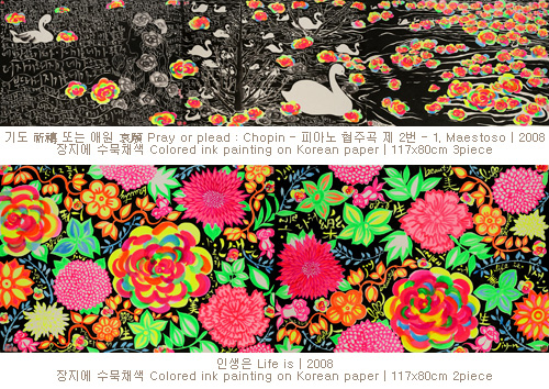 형형색색의 꽃들이 홍지윤의 붓에서 흐드러지게 피어난다. 사이좋은 새들이 홍지윤의 붓끝을 타고 겅중겅중 꽃사이에서 노닌다. 화선지 위에서 이정도면 한 판 제대로 잘 놀았구나 싶은데 무어가 아쉬운지 빈 여백도 없이 공간을 타고 글들이 흐른다. 그리고 그곳에 흐르는 글들은 너무도 정직하게 읽히는 홍지윤의 일기요, 詩다.