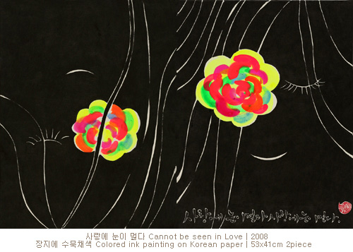 전통의 방법을 막연히 답습하는 것이 아니라 자신에게 가장 잘 맞는 방법이기에 고수하고 있는 먹과 종이. 그런 그를 두고 화선지 위에 먹과 붓으로 시를 쓰고 그림을 그려 넣었으니 굳이 옛문헌이나 기록에 의존한다면 현대판 문인화라고 끼워맞출 수도 있을 것이다. 먹으로 그린 후 미디어와 라이트박스 작업을 통해 보여주고 있으니 퓨전 동양화라 부를 수도 있을 것이다. 그러나 나는 굳이 그렇게만 단정지어 부르고 싶지는 않다.