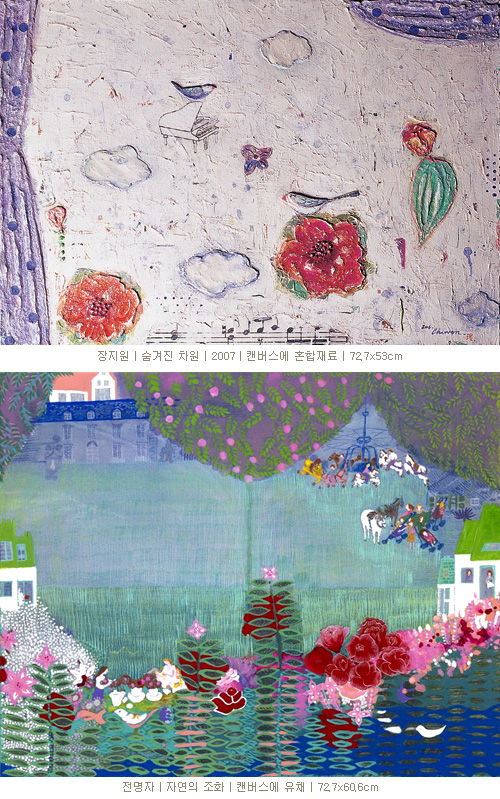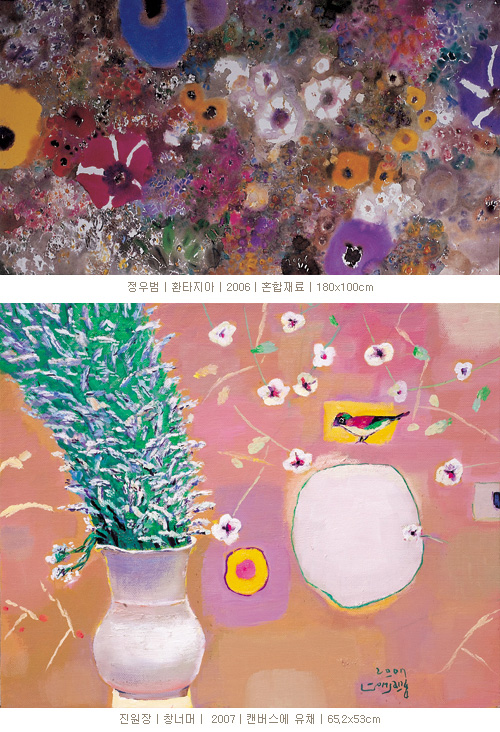 한운성·박영근 선생님은 자연의 내밀한 이치를 과일로 담아내십니다. 꽃이 마음 깊숙히 품었던 생명의 본 모습 입니다. 그래서 두분 선생님의 작품에서는 단단한 생명력이 보입니다.장완·정우범·전명자·장지원 선생님은 꽃이 보여주는 생명의 울림을 독특한 질감과 색채로 나타내십니다. 최영훈·진원장·최한동 선생님은 봄의 화려한 이미지를 색채로 보여주십니다. 행복한 외침 같습니다. 아홉분 선생님께서 훌륭한 작품으로 지금 여러분들께 행복한 말걸기를 시작하셨습니다.