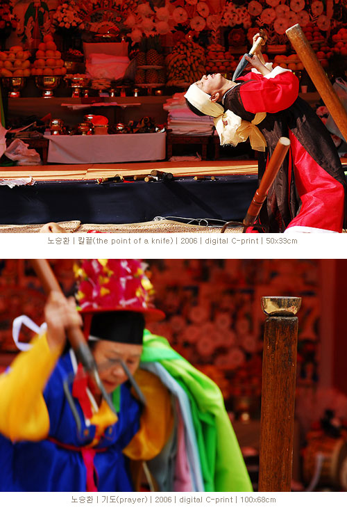 사진이 온통 붉은 색 천지다. 배경도 주인공도 피사체(被寫體) 모두가 붉다. 작가는 무당이 입고 있는 청, 적, 황, 백, 흑의 오방색(五方色) 의상조차도 붉게 찍어냈다. 원초적인 생명의 힘이 강렬하게 온 몸으로 엄습해온다. 마치 장예모(張藝謨, Zhang Yimou)감독의 영화