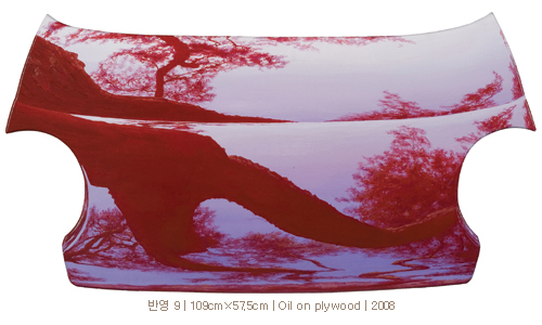 ‘소나무 만다라’(박희진 시집)라는 말이 가능할 정도로 소나무의 둥치와 가지, 잎들이 품고 있는 세계는 또 하나의 소우주이고, 그러한 풍경을 완상하며 음미하는 것 자체가 자아와 세계의 소통과정에 다름 아니다. 이번 작업에서는 현대적 삶 속에 반영된 풍경, 즉 형태가 왜곡되거나 흐릿한 이미지로 추상화되고 해체되는 전이과정을 드러내면서 현대인의 심상 속에 번안된 소나무들이 선보이고 있다. 또한 작가는 노동의 프로세스를 통해 한 그루 소나무가 품고 있는 시 공간의 무게에 접근해가는 묘미도 느끼는 듯하다. 이번에 전시되는 20여점의 작품 중에 9점은 베니어합판을 보닛 모양으로 가공하여 만든 작품들이다. 금속성과 나무의 질감 차이가 엿보이기도 한다.