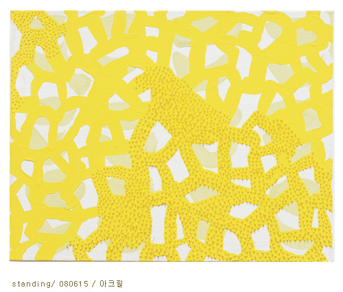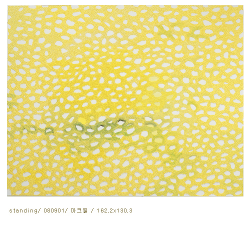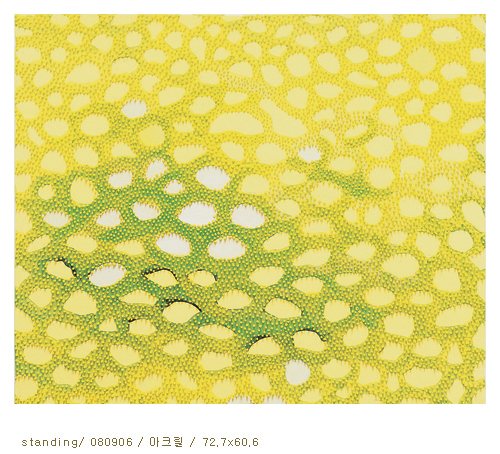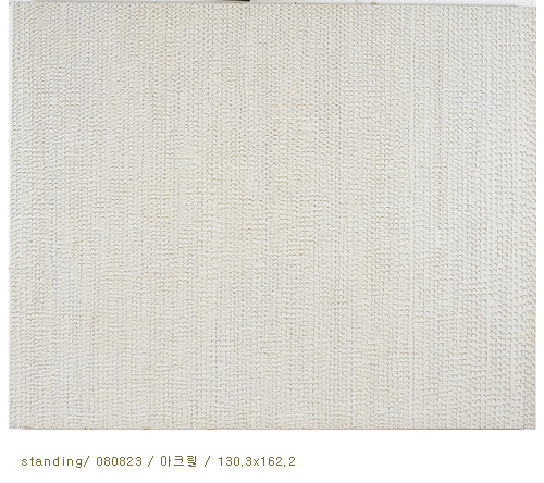 안료에 대한 작가 나름의 독특한 시선에서 출발하여 '물감 세우기'라 부를 수 있는 새로운 안료의 방법론을 선보인다. 기존의 관습적인 방식에서 벗어나 안료를 평면에서 직각으로 새워 앞으로 나오게끔 하는 입체적인 방식으로 전치시켜 색다른 차원의 표현을 보여준다.