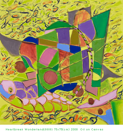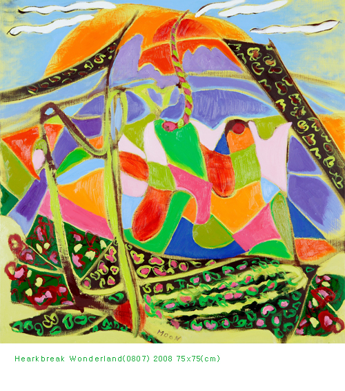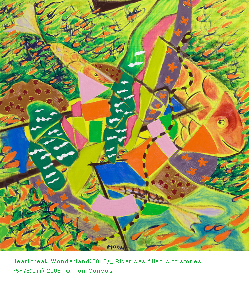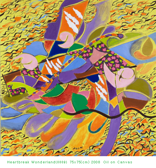 작가의 최근 작품들 가운데에서 보다 더 다양한 모습을 선보이는 'Heart Break Wonderland' 의 음악은 World’s End Girlfriend 라는 일본의 카츠히코 마에다라는 작곡가의 앨범중 하나이다. Bjork와 World’s End Girlfriend의 공통점은 아마도 그들의 손에 잡히는 것은 모두 악기가 된다는 점과 신비한 음색으로 여행자의 관조적 운율이 매력적이다. 작품 'Heart Break Wonderland' 또한 화면 안에서 붓놀림의 속도가 다양하고 색감의 두께 역시 일정하지 않아 시각적 긴장과 풀어짐이 화려한 색감의 여행을 돕는다.