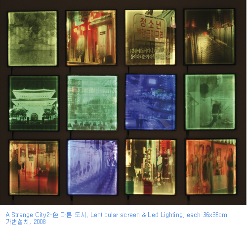 스테인리스 스틸위에 도시의 풍경 등을 담은 사진을 인화한뒤 포토 에칭 방식으로 부식시켜 퇴색된 흑백 사진과 같은 화면을 만드는 판화 기법으로 구성된 전시