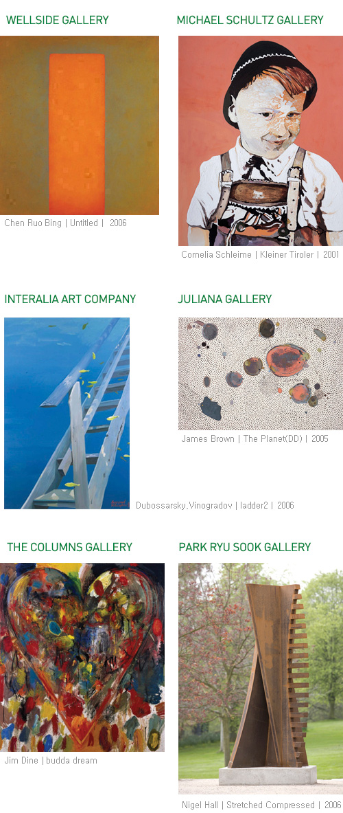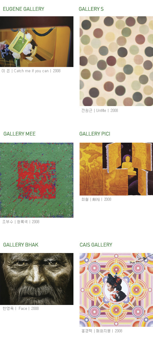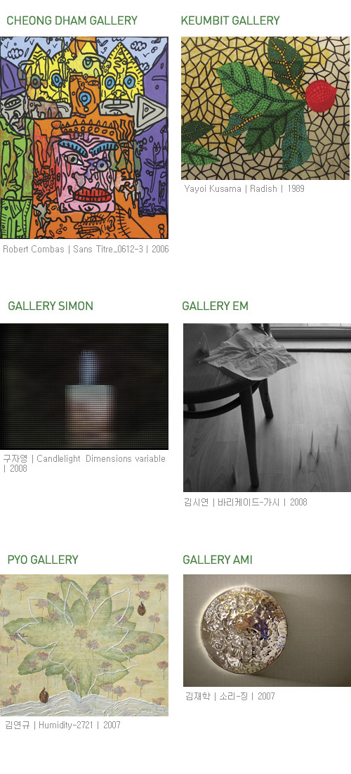 갤러리미, 갤러리 소, 갤러리시몬, 갤러리아미, 갤러리엠, 갤러리투, 갤러리피치, 금빛갤러리, 더 컬럼스갤러리, 마이클슐츠갤러리, 박여숙화랑, 박영덕화랑, 샘터화랑, 갤러리선, 유진갤러리, 이목화랑, 인터알리아, 주영갤러리, 줄리아나갤러리, 청담갤러리, 청화랑, 카이스갤러리, 표화랑(가나다 순), 총 60여 명의 작가 참여 예정