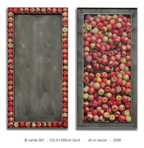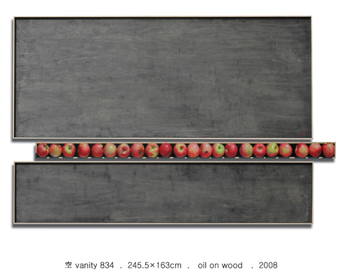 그에 의해 새로운 존재가치를 얻게 된 사과는 더 이상 아름다운 정물의 소재에 머물지 않는다. 조형적인 관념의 세계를 탐조하는 여행의 동반자가 되고 있다. 그렇다. 사과라는 소재의 여행은 이제 자의적인 조형공간, 즉 기하학적인 구조물로 이루어진 나무화판과의 다양한 변주를 통해 그 때마다 존재방식을 달리하면서 현대미술 그 중심으로 이동하고 있다.