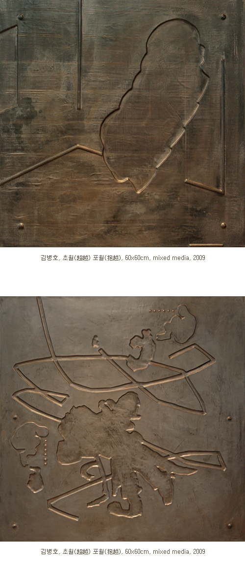 김병호의 작업은 단순한 기호로 되어 있다. 책, 인간, 꽃, 수직으로 뻗은 점을 완전한 형태 혹은 부분적으로 사용해 이 주제를 상징한다. 이 기호들은 가장 평범한 비율로 감정이 섞이지 않은 솔직한 일정한 두께의 선으로 그린다. 그리고 반투명 트레팔지에서 완벽한 선으로 준비되어 나무판으로 된 화면으로 옮겨진다. 가장 평범한 형태를 가장 완벽하게 준비하는 것이다. 이것이 그가 늘 생각하는 “초월”과 “포월”의 개념이다. 단순하고 평범함에서 가장 아름답고 영성이 가득한 정신세계를 담아내는 것이다. 그것은 서로 멀리 떨어져 있지 않다. 한 화면에서 사람은 구부리고 앉아 있거나 서서 걸어 다니는 형태가 연속으로 등장한다. 그것은 시간을 말하는 것이다. 이미 바탕화면에 음각으로서 파놓으면서 예비 된 구원된 자로서의 선택된 존재를 담아낸다. 그리고 말씀을 지키며 늘 기도하는 행위를 삶에서 실천하며 나오는 절제된 선과 기다림의 산화되는 납에서 두 번째 구원이 이루어지기를 바란다. 세 번째는 작업의 결과물을 통해 결국 하나님으로의 구원으로 연결되기를 원한다. 이것이 평범한 실존의 인간으로부터 나온 주제 “초월”과 “포월”이다. 그의 실루엣으로 된 각 형태는 그들의 본질을 말하고 있으며 서로 다른 정체성을 갖고 있다. 김병호의 작업은 참 경건하다. 특별하거나 과장된 감정적 상태가 아닌 단순한 선으로 나를 가다듬으며 하늘과 닿아 있고자 하는 행위의 실천적 작업이다. 납이란 문명의 상징 속에 둘러싸인 인간의 환경이지만 자신을 깊게 다듬고 내면의 영성을 가꾸는 것이란 본질이야말로 늘 하나님과 하는 평안한 삶을 영위하는 것이다.