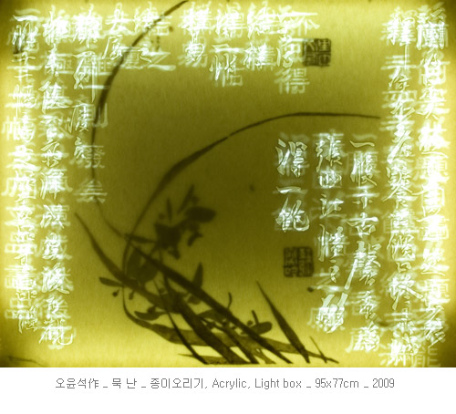 오윤석은 서체를 오려낸 종이를 겹쳐 빛을 통과시켜 평면과 입체의 경계를 표현한 설치작업을 한다. 그는 문자를 오려내어 파인 부분을 여러 겹을 겹치거나 파낸 조각을 말아 그것에 빛을 투과시켜 그림자를 만든다. 주로 서간체라는 일상적인 편지글(시아버지가 며느리에게 보내는 칭찬 글, 귀향 간 스승이 제자에게 보낸 감사의 글 등)들을 선택하여 칼로 오려내고 일부를 남겨 말아 표면을 구성하는데 문자는 파인 선과 말린 선들의 날카로운 질감으로 인해 인식되지 않고 질료의 물성만 강하게 부각된다. 문자는 역사 속에서 이미 선행학습 되어온 시간을 지니는 읽고 이해하는 인식의 분야다. 오윤석은 이런 문자의 의미는 배제하고 이미지와 질료로 표면만을 건져 형상화시킨다. 빛이 통과해 만든 벽면의 그림자에 투영된 글씨는 읽을 수 있어 중층적으로 겹쳐진 앞면의 이미지문자만으로 점유된 감각의 변환을 가져온다. 문자이전 상형으로 먼저 다가온 과거 인류의 지식체계의 시간을 형상화시킨 것이다. 표면인 외부의 모호하면서도 추상적 이미지는 은유, 감정, 심리적 인식체계를 가진 문자를 내포하며 인식과 시지각의 초월적 감각을 제공한다.