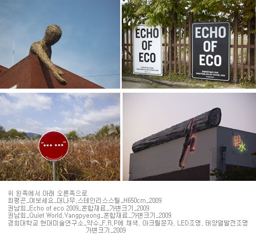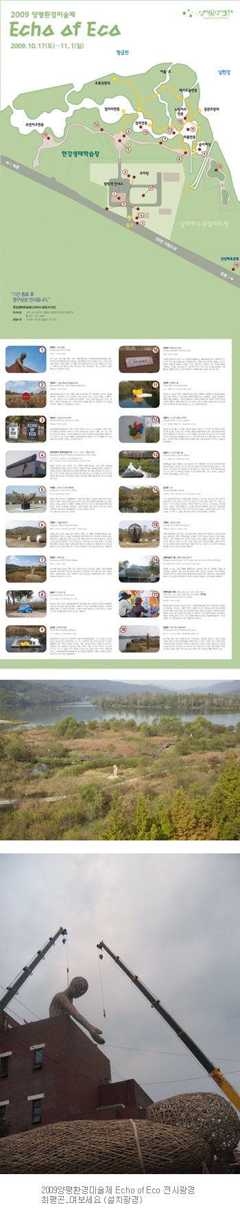 양평환경미술제 조직위원회는 2009년 10월 17일부터 11월 1일까지 경기도 양평군 강하면 일대의 한강생태학습장, 하수종말처리장을 중심으로 제2회 양평환경미술제를 개최합니다. 이번 미술제는 ‘Echo of Eco(생태의 메아리)’라는 전시로, 국내 최초 농업특구지역으로 빼어난 자연 경관을 자랑하는 양평의 문화자원과 지역적 특성을 예술작품과의 결합으로 양평의 과거, 현재, 미래의 상을 제시하는 것을 목적으로 합니다.