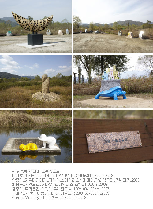 관내 및 초대작가로 구성된 11명(팀)은 각기 생태학적인 해석과 연구 작업을 통하여 약 30여점의 야외 조형물로 학습장 내 습지와 연못, 강, 조망대 등 풍광과 시설을 적극 활용한 친환경적인 예술공간 조성을 이루어갈 것입니다. 특히 기존 전시장소를 관내 야외 특정 공간인 생태공원에 집중, 전시하고 전시기간 종료 후 참여 작품을 영구설치 함으로서 지속성을 띤 생태/환경특정적인(eco-specific) 공공미술프로젝트를 선보입니다.